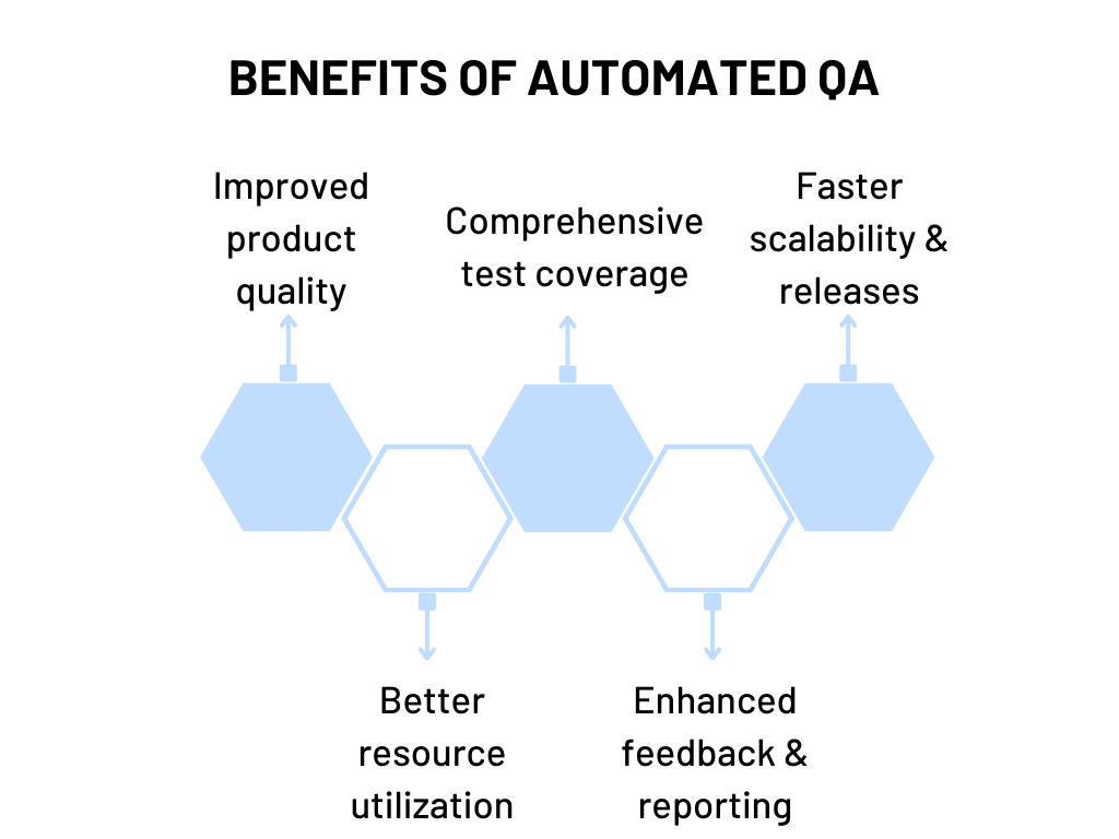 There are countless advantages of QA automation in software testing, including increased productivity, accelerated test procedures, and better outcomes. Moreover, automation and sophisticated tools help minimize time to market and costs and enhance test coverage.