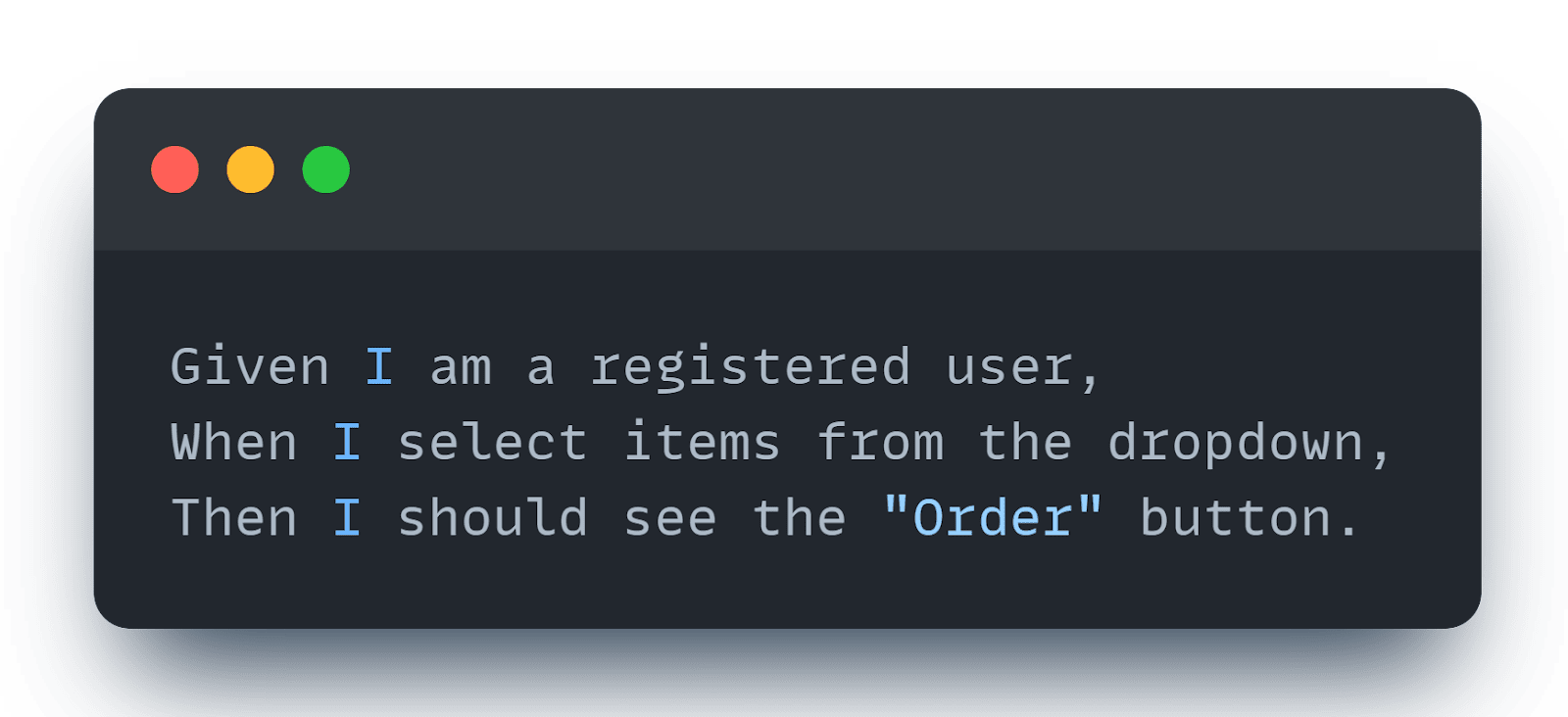 User stories are then broken down into specific scenarios that describe the system’s expected behavior. These scenarios are written in Gherkin syntax, using the Given-When-Then format: