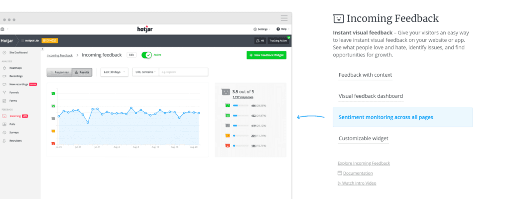 For browser-based web applications, e-commerce sites, and other types of websites, you can easily set up sentiment monitoring with a tool like Hotjar. For mobile apps, you can use something like Mopinion, Confirmit, or custom-build an NPS score collection feature.