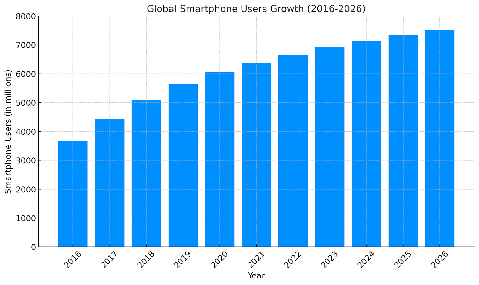 This chart shows the growth of global smartphone users from 2016 to the projected figures in 2026. It highlights the importance of mobile app compatibility testing as the user base expands rapidly.