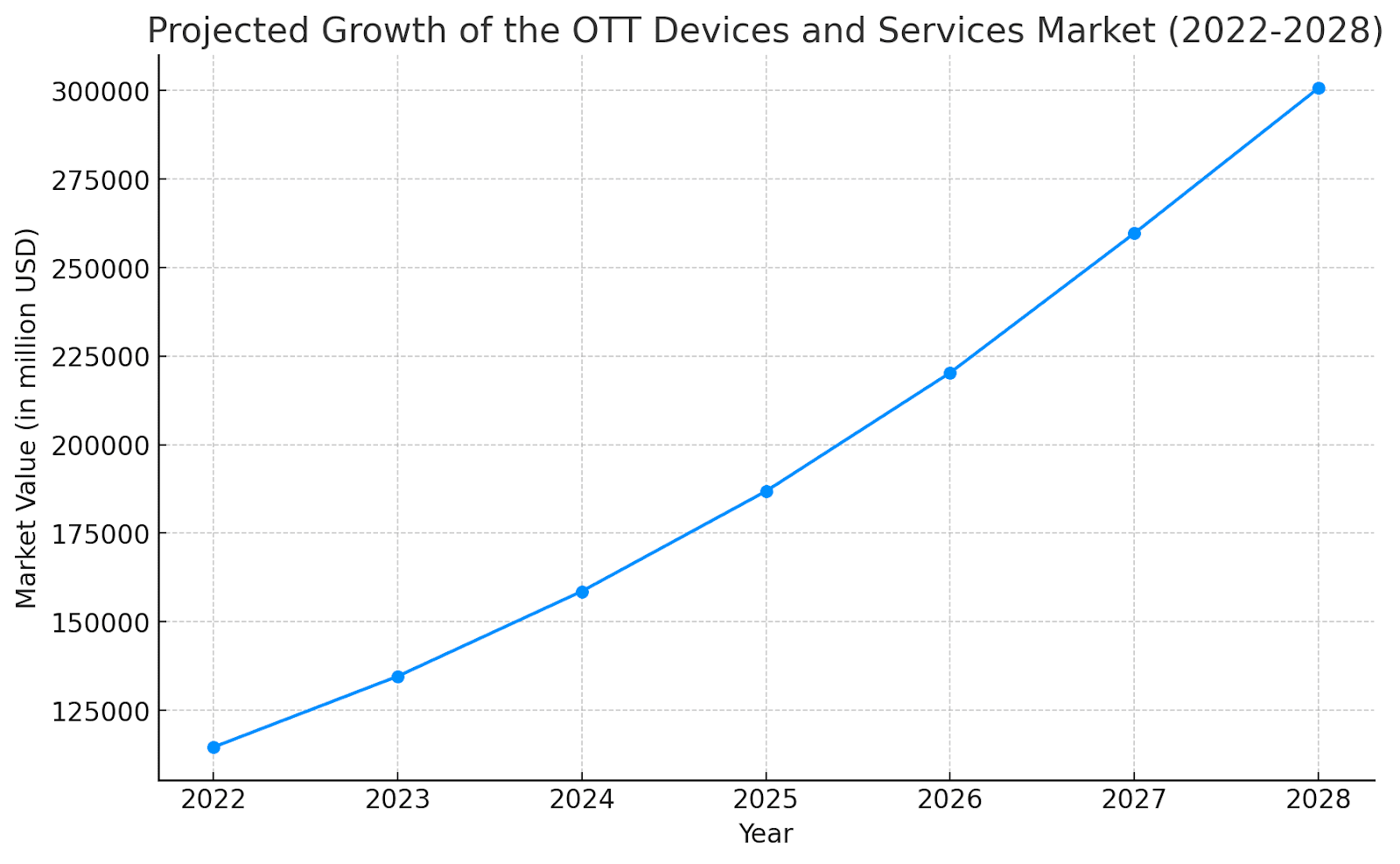 The OTT Devices and Services market is expected to show strong growth over the next five years. In 2022, the global market was valued at approximately USD 114.55 billion, and it is projected to reach USD 300.73 billion by 2028, with a compound annual growth rate (CAGR) of 17.45% during the forecast period.