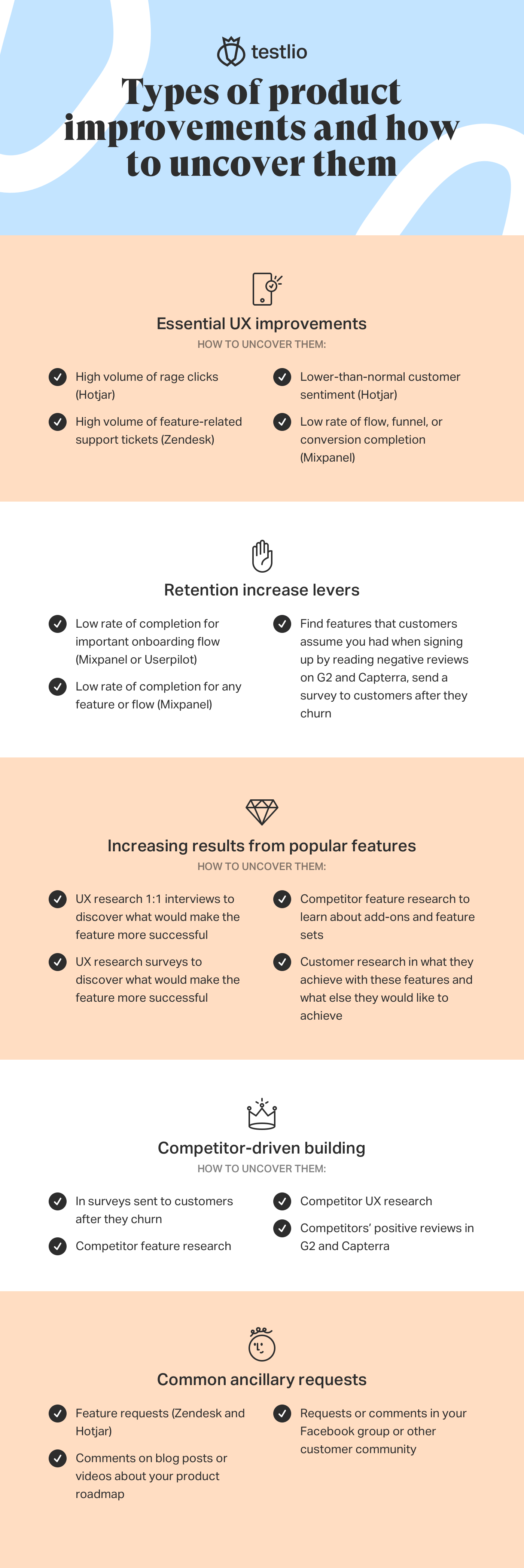 Below, we detail key categories of product improvements and give you tips on how to find the ones you need to prioritize.