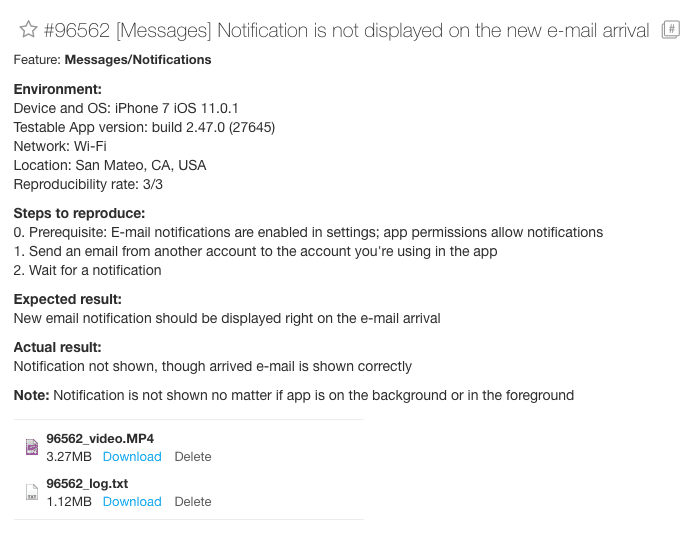 Or I find a bug after pressing push notification. I’ll need to check if a crash occurs when the app is backgrounded or foregrounded. Or if the application has a few types of notifications, I’ll investigate if it crashes for all of the push notifications or only some of them and add this data to the notes as well. The more useful information, the better.