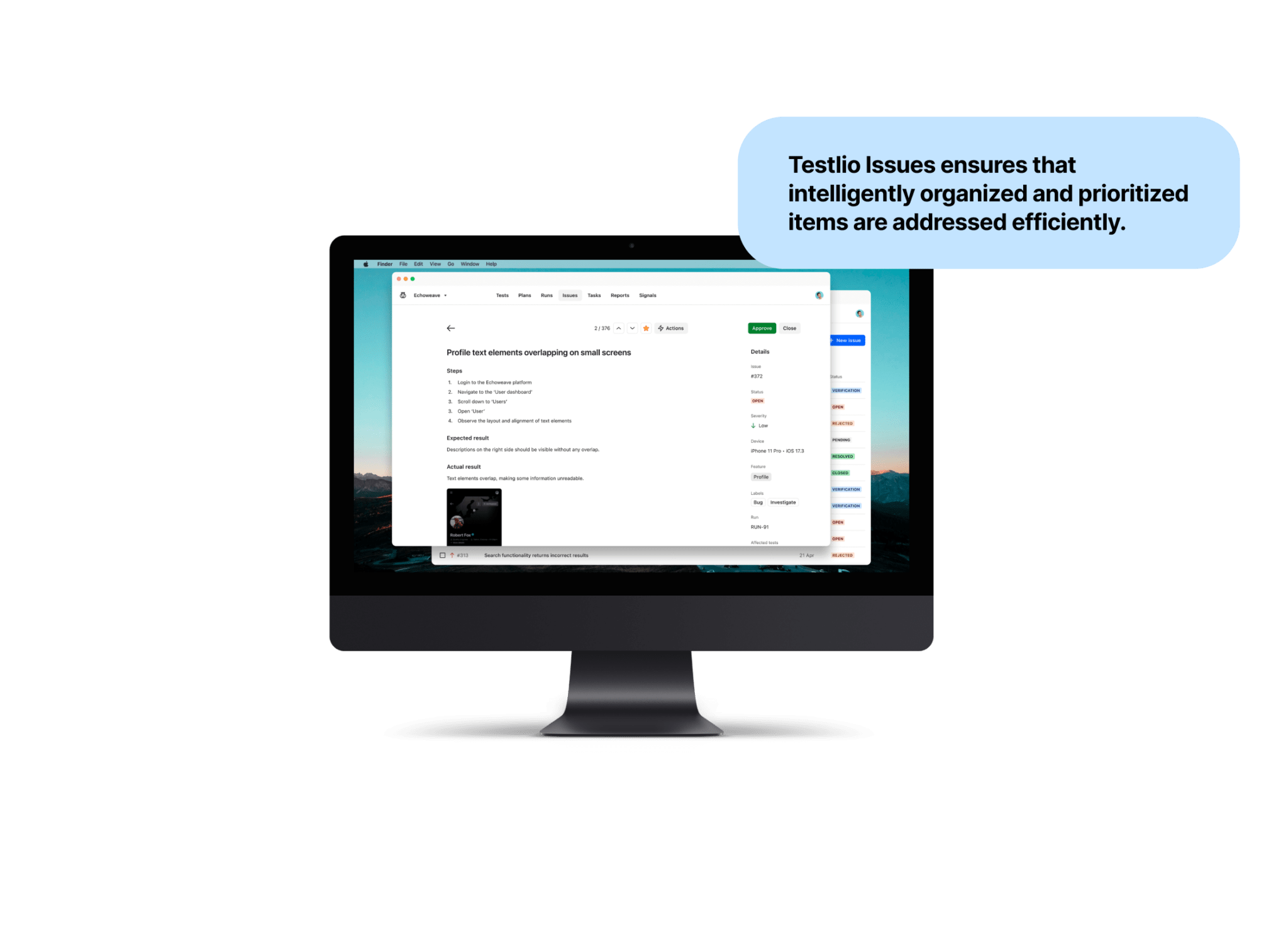 Assignments and results of reproduction attempts are seamlessly provided, bound to original issues. Easily identifiable during test execution for effective, efficient, and less noisy testing results.