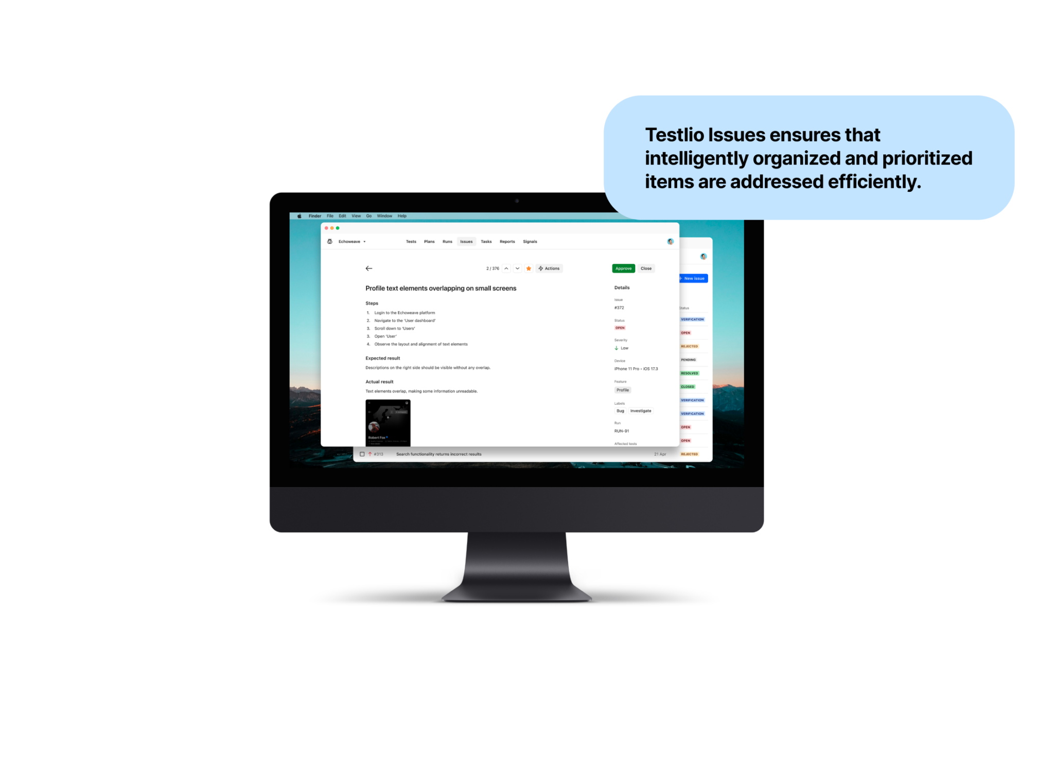 Testlio Issues offers intelligently structured templates for rapid creation. Issue reporting is enhanced by generative AI for more accurate and comprehensive descriptions.