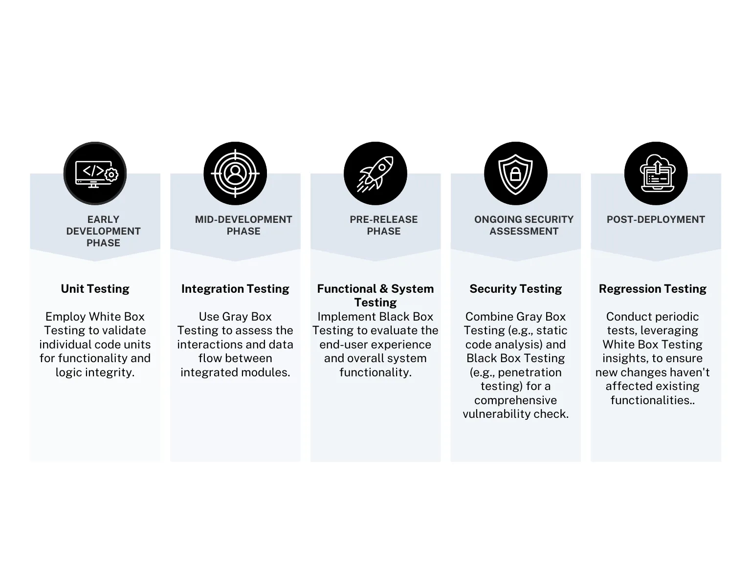 During the early development phase, developers utilize White Box Testing to perform unit tests to validate individual components or functions. As the mid-development phase approaches, Gray Box Testing comes into play for integration tests to evaluate interactions and data flow between components.
